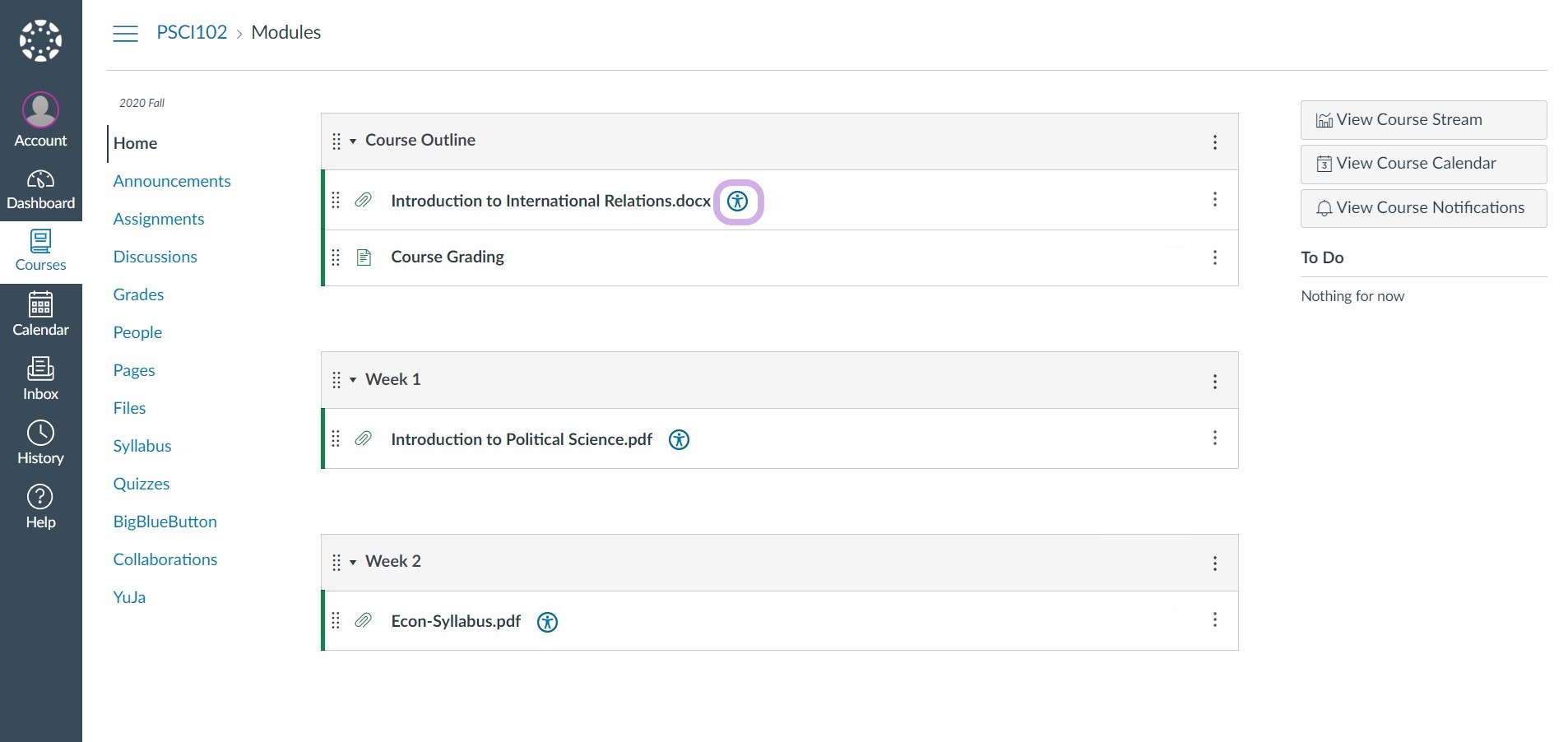 Once you find the course document, there will be an Accessibility icon to the right of the document title. Click the icon.